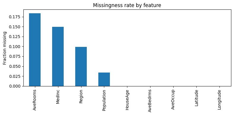 - Diagnose patterns (missingness rates + correlations with observed features).